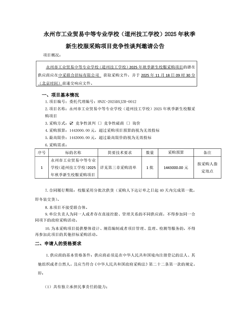 永州市工业贸易中等专业学校(道州技工学校)2025年秋季新生校服采购项目竞争性谈判邀请公告