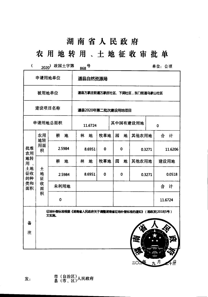 省级人民政府批准用地批复文件(道县2020年第二批次建设用地项目)