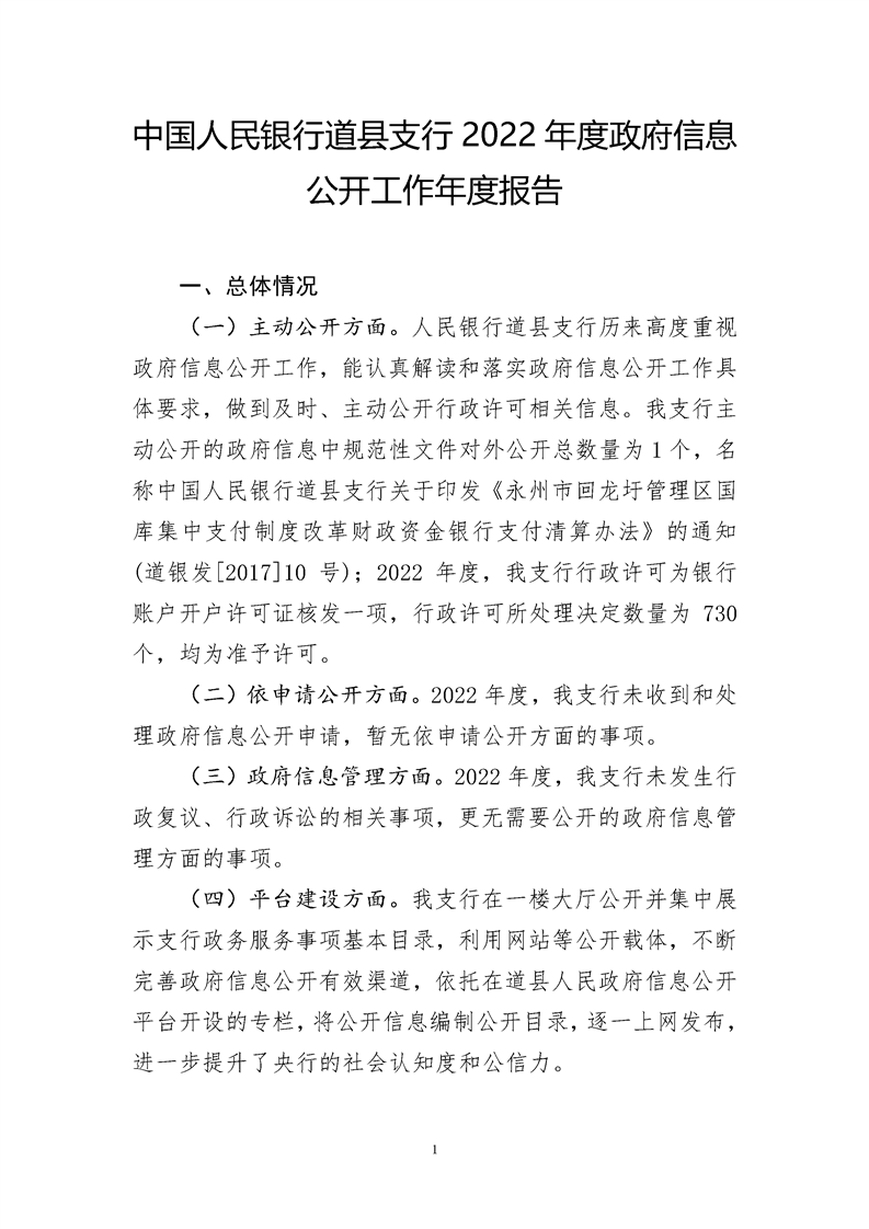 中国人民银行道县支行2022年度政府信息公开工作年度报告