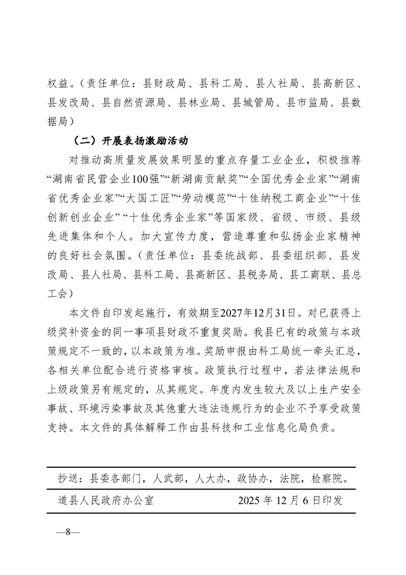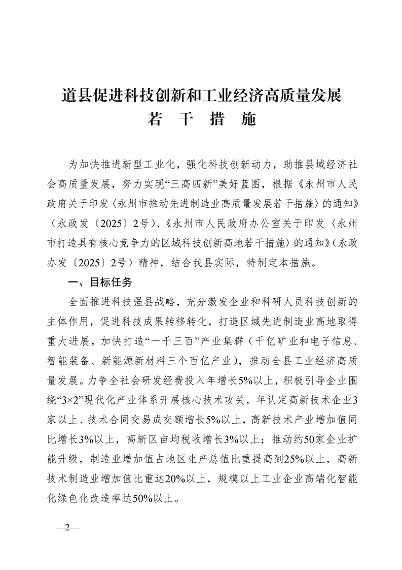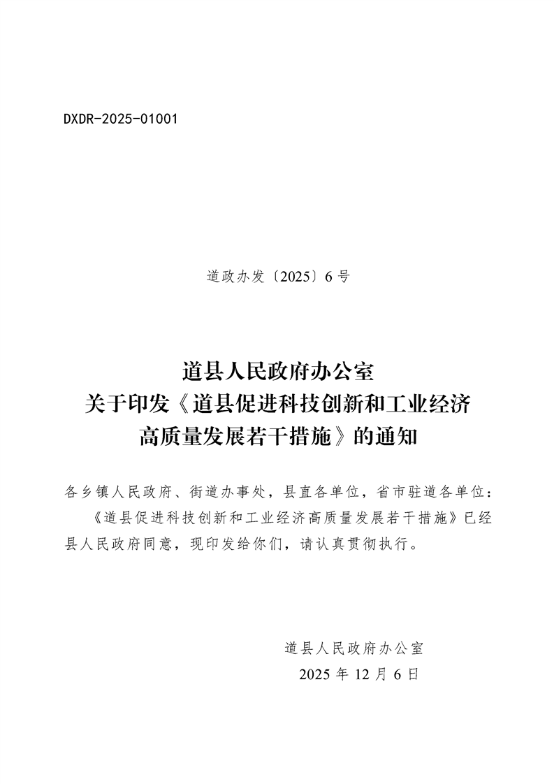 道县人民政府办公室关于印发《道县促进科技创新和工业经济高质量发展若干措施》的通知