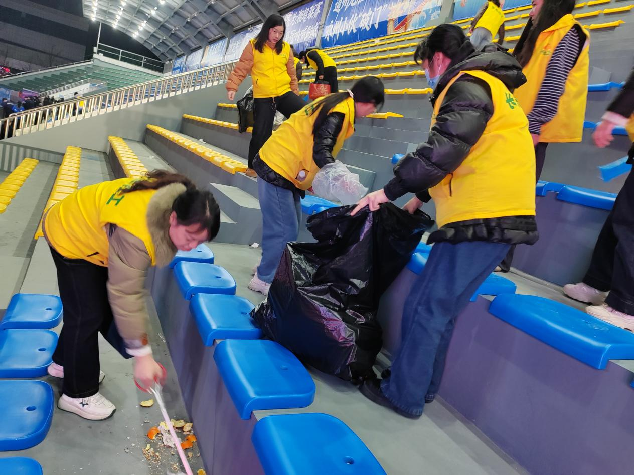当终场哨响,精彩赛事落幕,观众陆续离场后,社工们的服务仍未结束。她们迅速转入“清洁模式”,拿起清扫工具,分组对观众席区域、走廊过道等进行了细致的清理工作。捡拾废弃物品、整理遗留杂物、清扫地面……她们用实际行动践行着“人走场净”的环保理念,恢复了场馆的整洁面貌,为后续场馆利用奠定了良好基础。