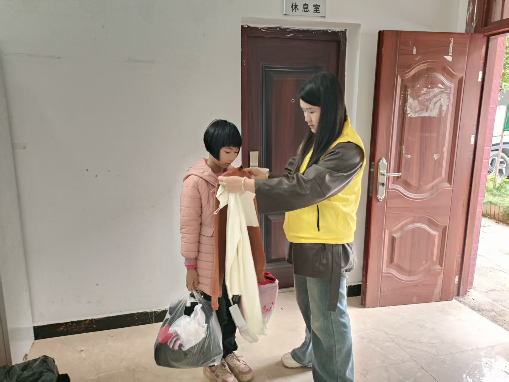 在集中发放现场,孩子们领到崭新合身的棉衣、毛衣等御寒衣物,脸上绽放出灿烂的笑容。社工们一边为孩子们试穿,一边与他们亲切交谈,给予温暖的鼓励。此外,社工们还携带衣物入户走访,在送去防寒物资的同时,也详细了解其家庭近况,耐心讲解相关帮扶政策,实现了物质援助与精神关怀的双重送达。