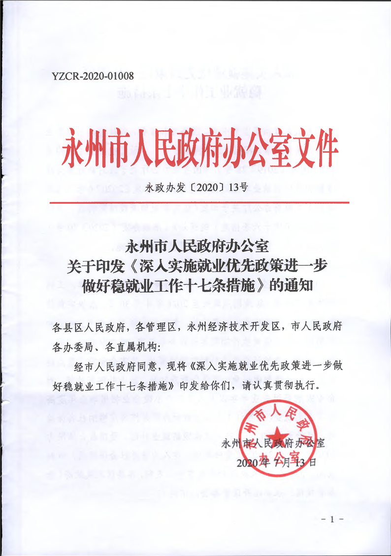 永州市人民政府办公室关于印发《深入实施就业优先政策进一步做好稳就业工作十七条措施》的通知