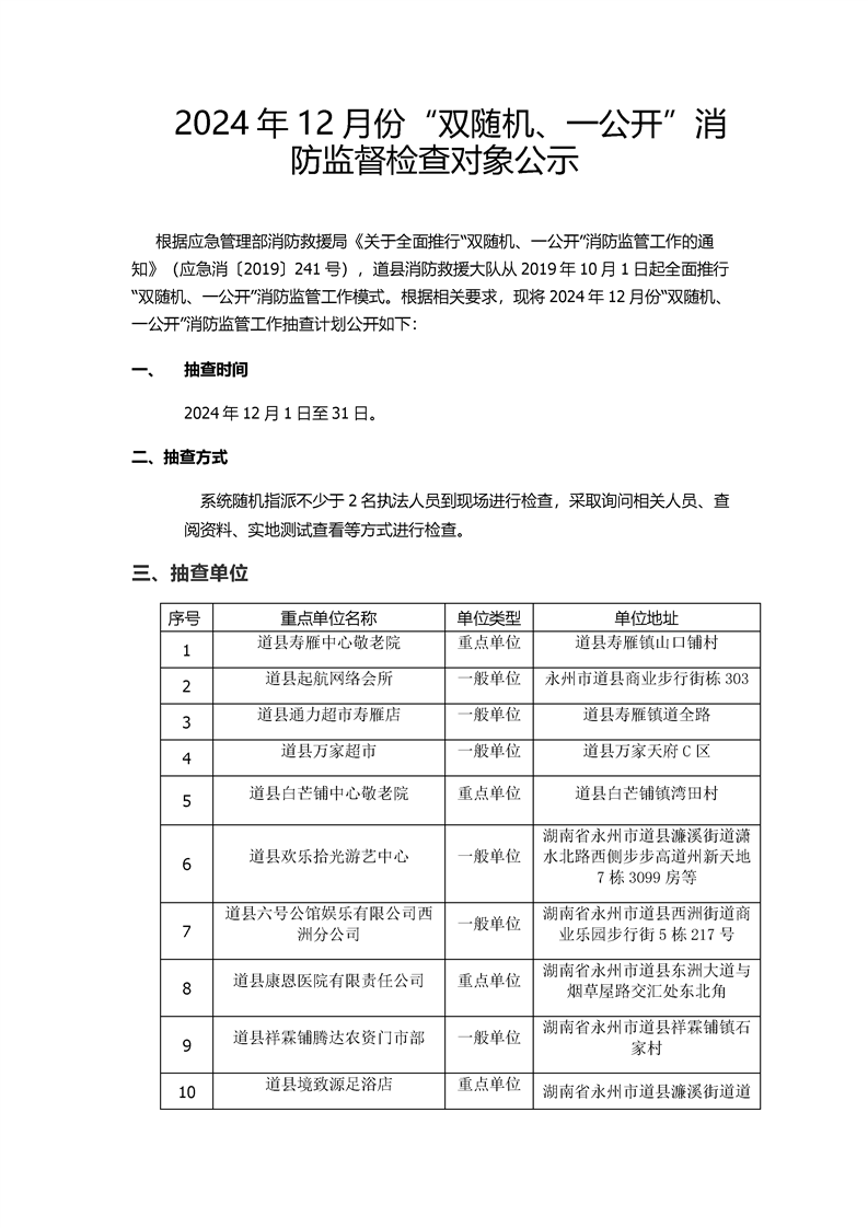 2024年12月份“双随机、一公开”消防监督检查对象公示