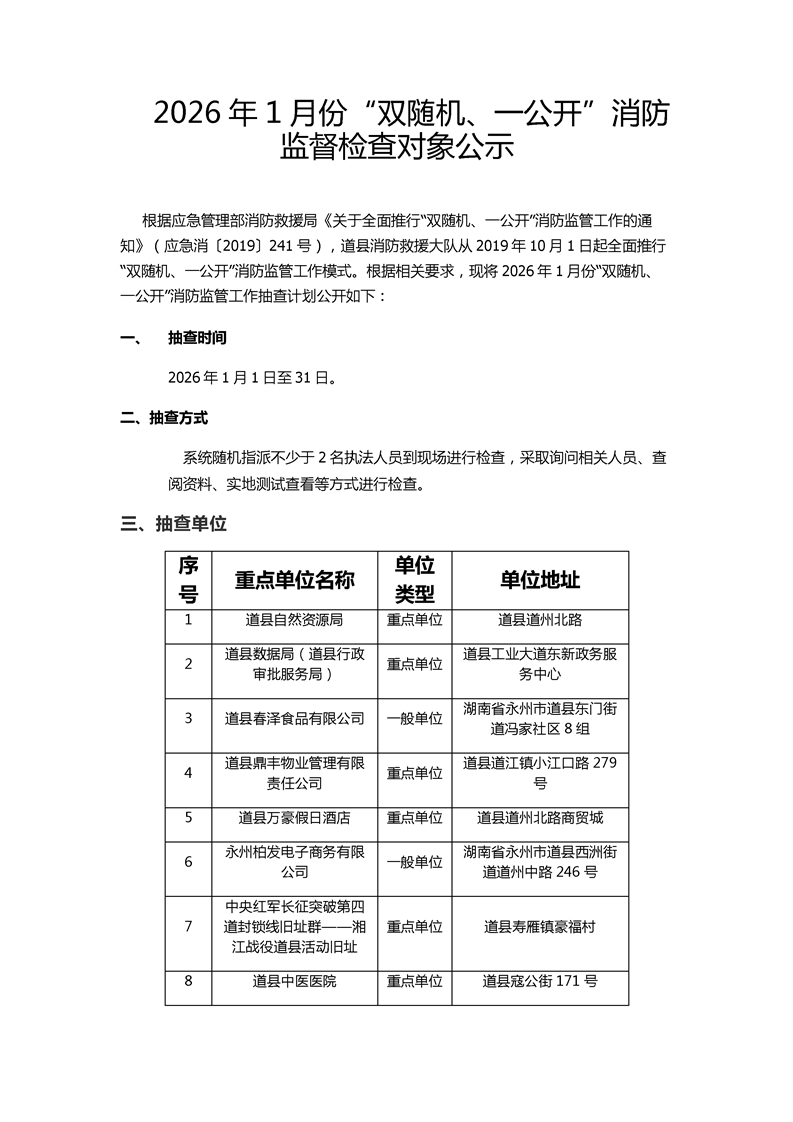 2026年1份“双随机、一公开”消防监督检查对象公示