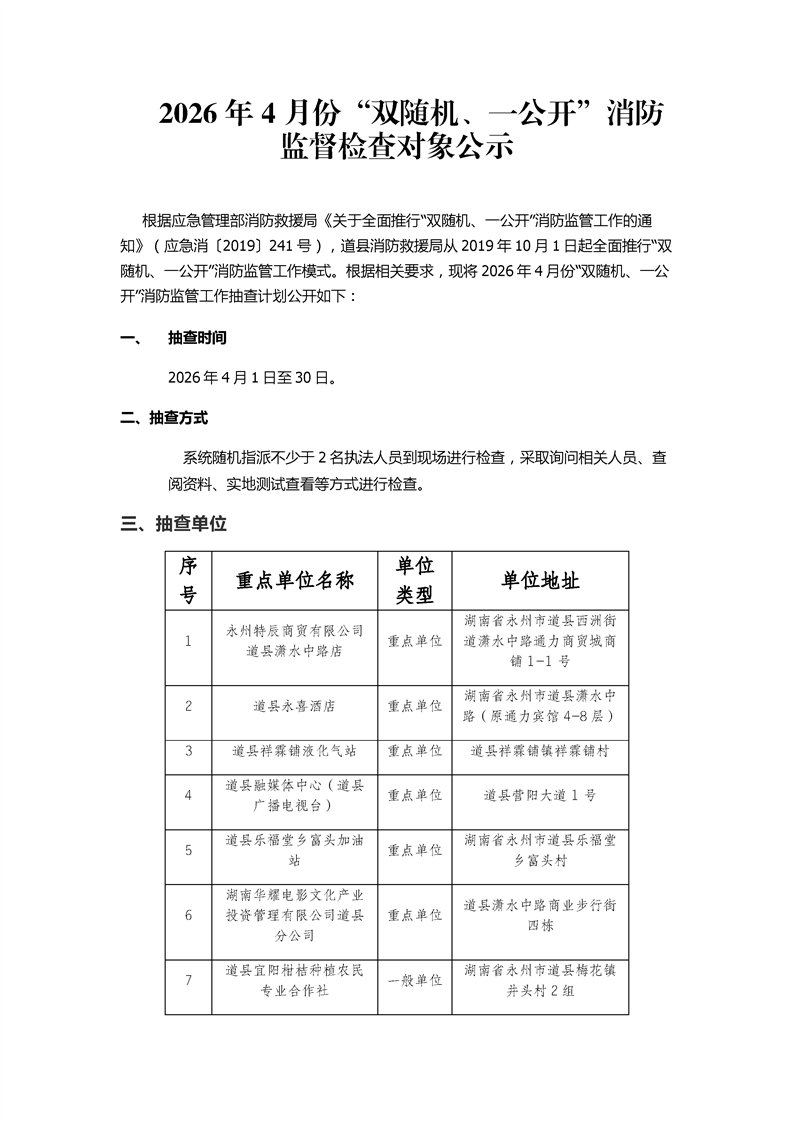 2026年4月份“双随机、一公开”消防监督检查对象公示