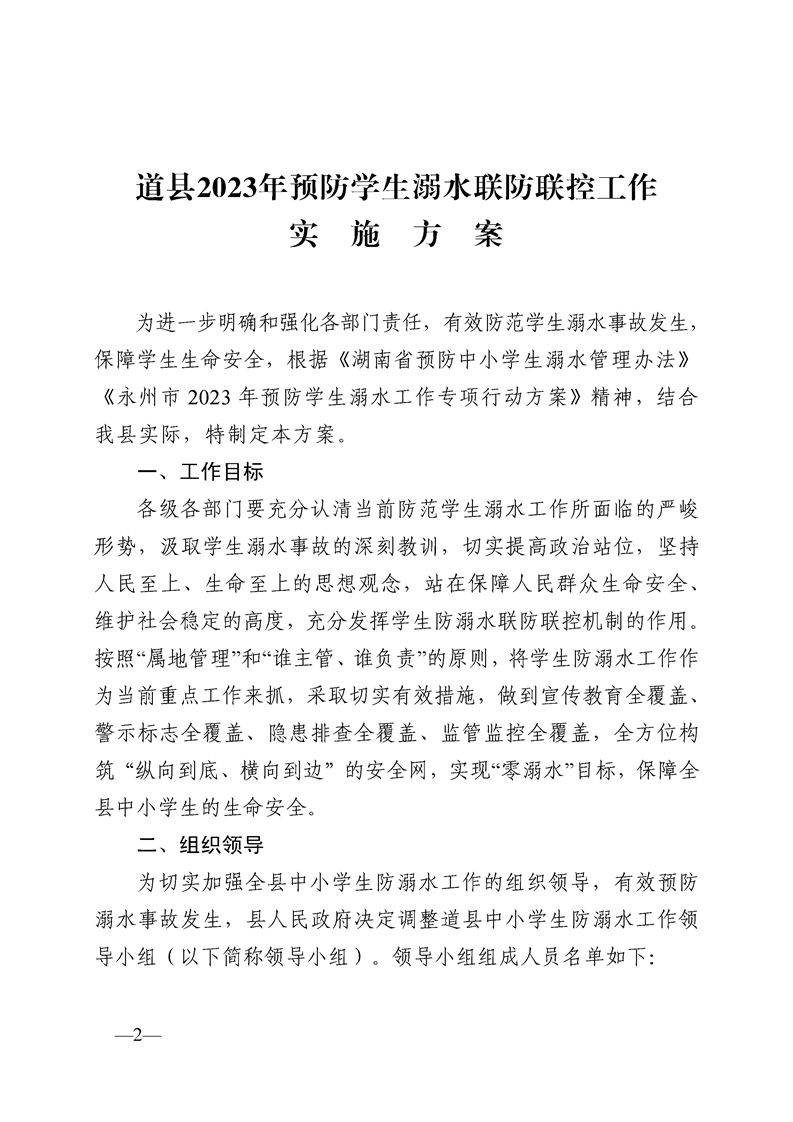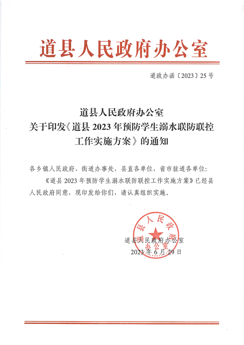 道县人民政府办公室关于印发《道县2023年预防学生溺水联防联控工作实施方案》的通知