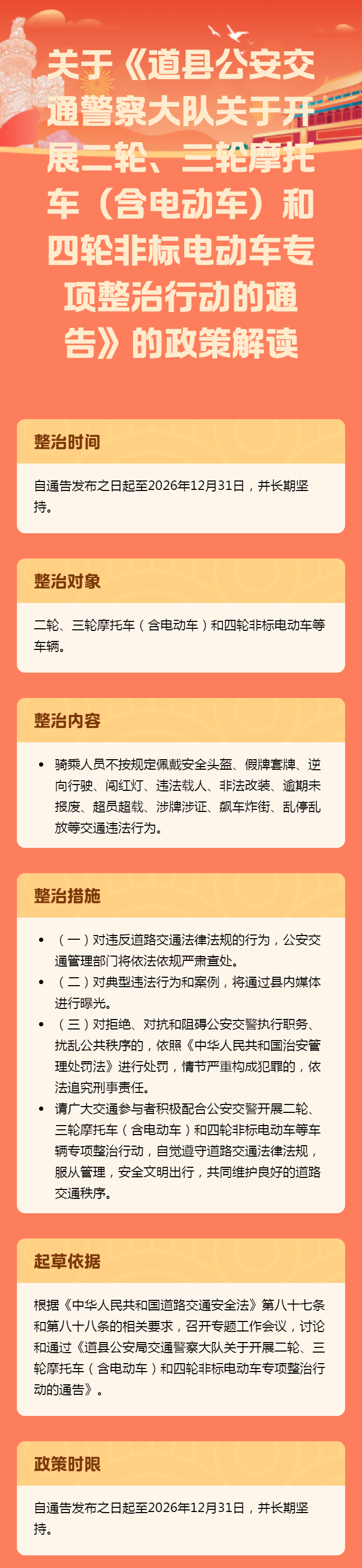 道县公安局交通警察大队关于《道县公安局交通警察大队关于开展二轮、三轮摩托车(含电动车)和四轮非标电动车专项整治行动的通告》的政策解读