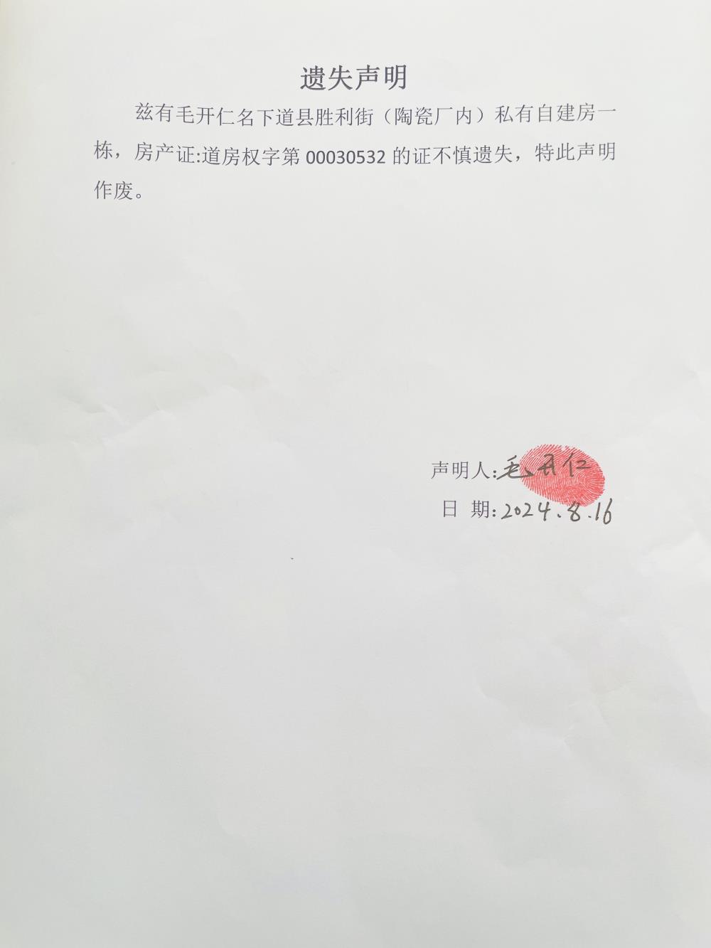 遗失声明(毛开仁)