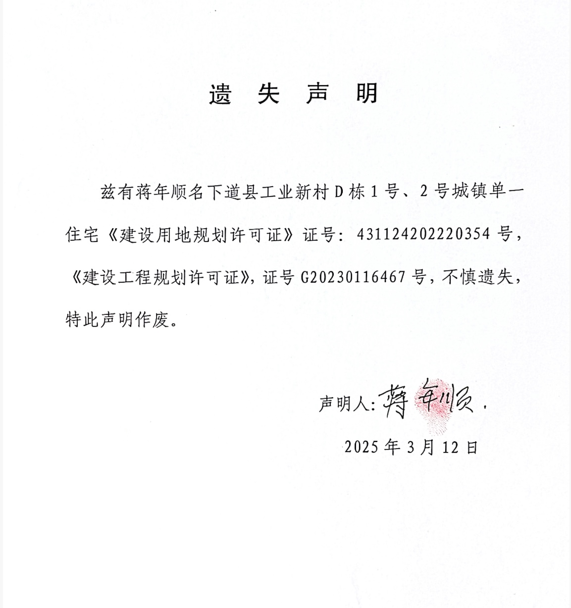 遗失声明(蒋年顺)