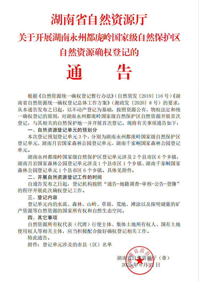 湖南省自然资源厅关于开展湖南永州都庞岭国家级自然保护区自然资源确权登记的通告