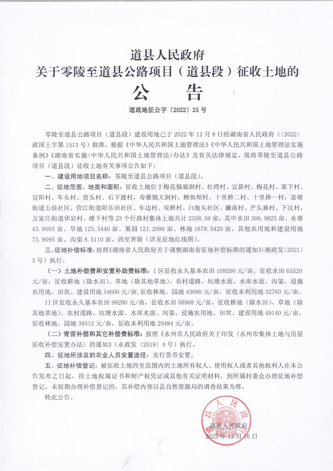 道县人民政府关于零陵至道县公路工程建设项目(道县段)征收土地的公告