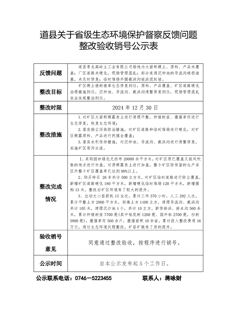 道县关于省级生态环境保护督察反馈问题整改验收销号公示表(道县粤龙高岭土工业有限公司)