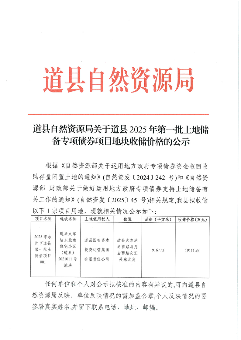 道县自然资源局关于道县2025第一批土地储备专项债券项目地块收储价格的公示