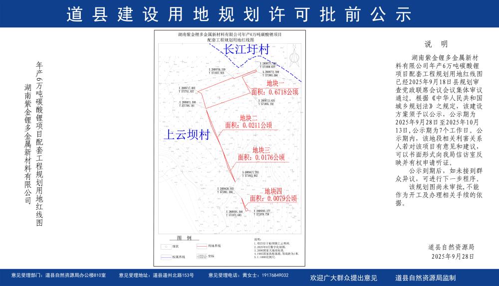 湖南紫金锂多金属新材料有限公司年产6万吨碳酸锂项目配套工程规划用地红线图批前公示