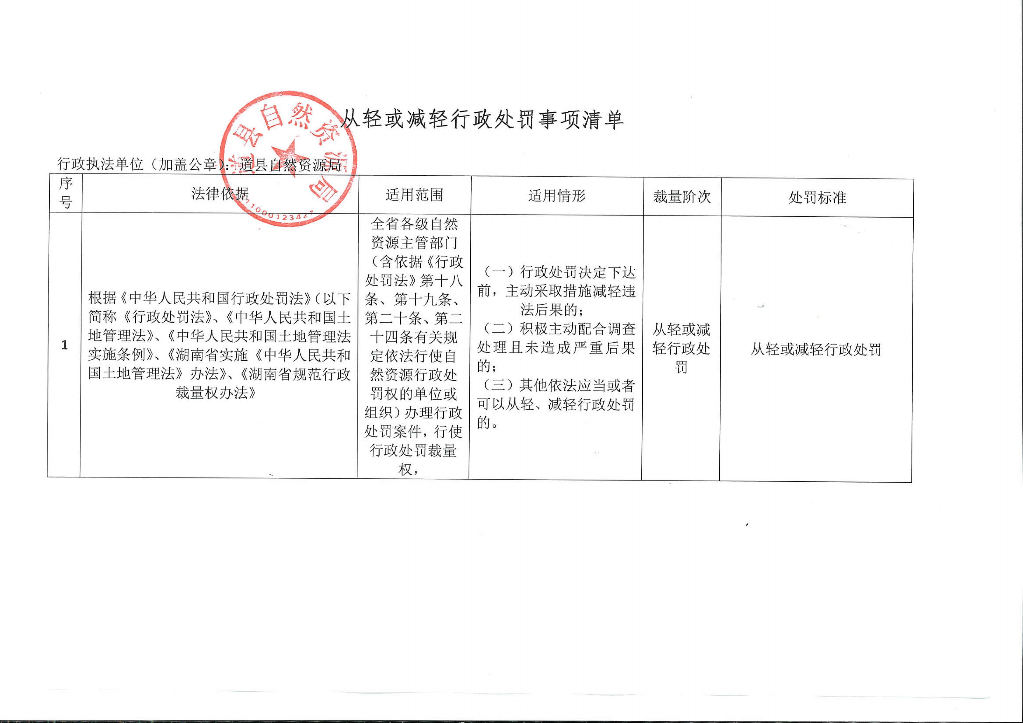 道县自然资源局从轻或减轻行政处罚事项清单