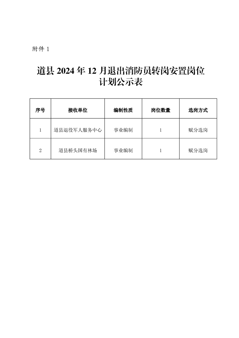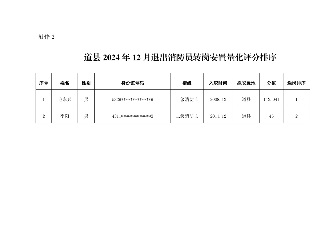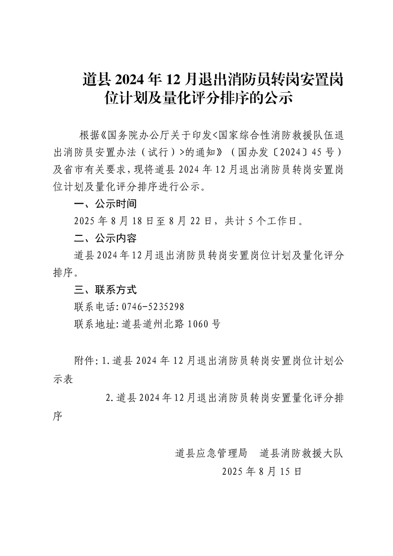 道县2024年12月退出消防员转岗安置岗位计划及量化评分排序的公示
