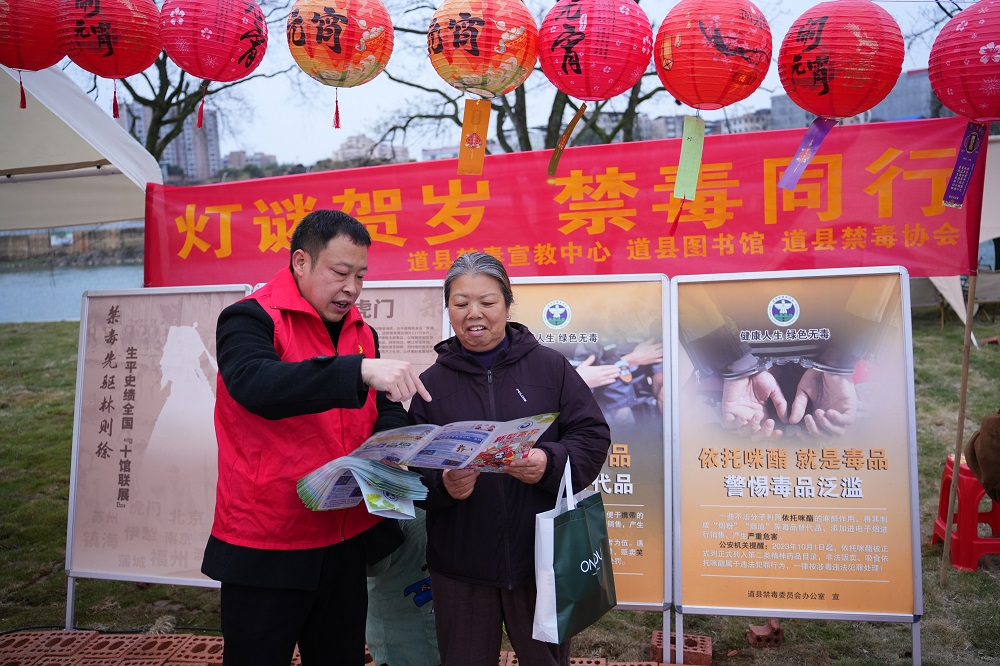 近日,道县禁毒宣教中心联合县公安局禁毒大队、县图书馆、县禁毒协会将禁毒知识巧妙地“打包”进传统民俗,在国家非遗龙船广场开展了一场以“灯谜贺岁禁毒同行”为主题的禁毒宣传活动,让群众在欢乐祥和的节日气氛中学习禁毒知识,共筑思想防线。