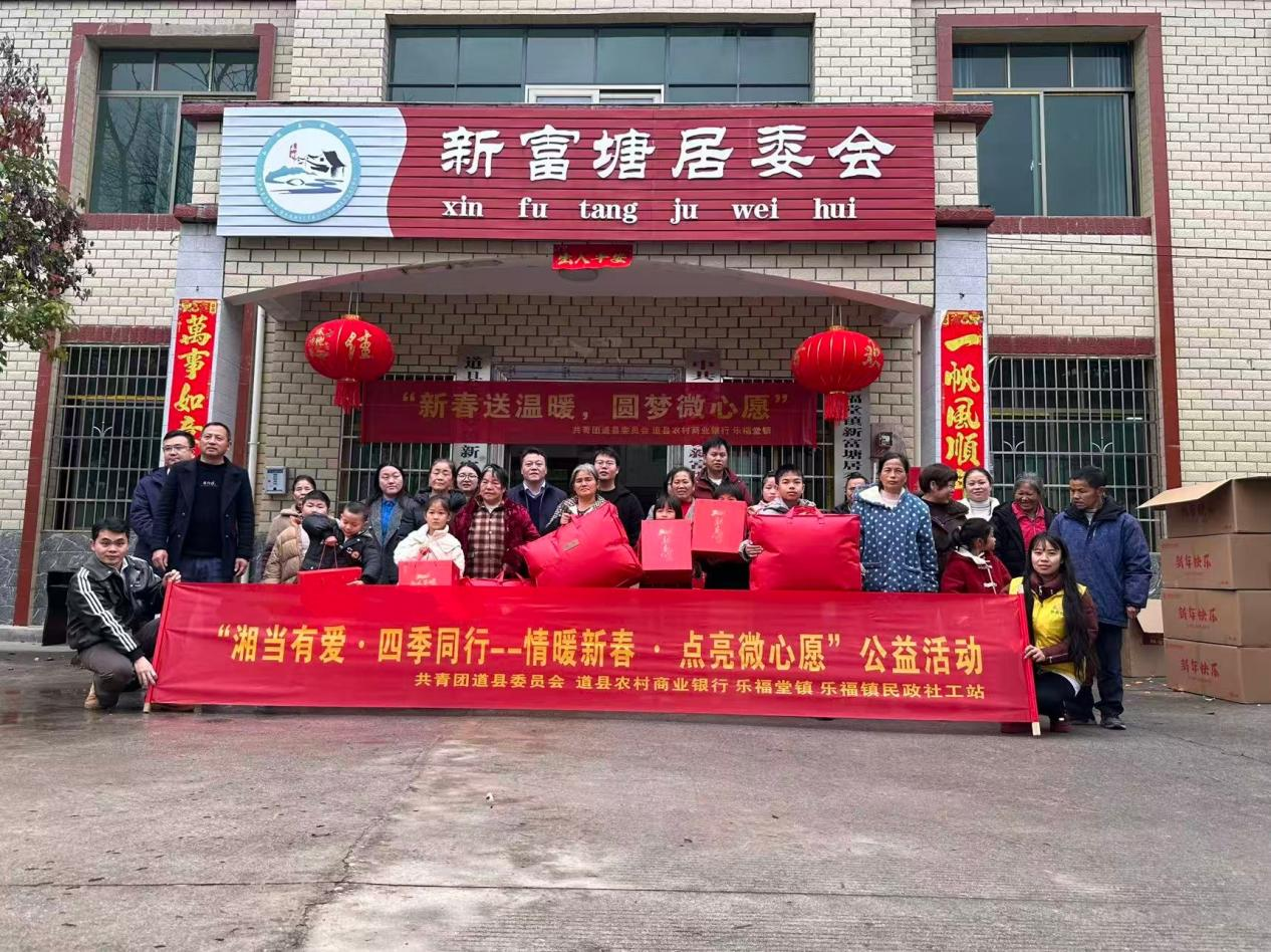 3月2日,道县乐福堂镇联合团县委、道县农村商业银行等单位,开展“新春送温暖·圆梦微心愿”公益活动。由县农商行总行捐赠的248份“新春暖心包”,通过新富塘、清塘坪、乐福堂三个村的集中发放点精准送达留守儿童与独居老人手中,让关爱跨越寒冬,在初春温暖延续。